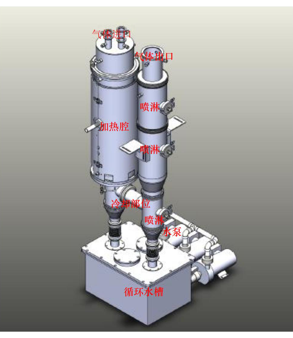 加热部分:是在针对工艺过程中B2H6,H2,BCL3,SiH4,SiHCL3,SiH2Cl2等可燃性气体通过高温氧化方式,将这些有害有毒气体处理成安全无害的气体或者粉尘,以及生成CL2,F2,HF等水溶性气体。